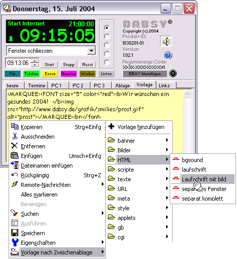 In den Ordner Vorlagen können in Unterordnern in beliebiger Ordnung Texte in Dateien stehen, die beim Aktivieren automatisch in die Zwischenablage geladen werden. Wenn man z.B. im Internet in einem Forum als Unterschrift den Link auf die eigene Homepage setzen möchte und diesen mit einem entsprechenden Bild aus dem Internet verschönern möchte, klickt man im eb!timer auf Vorlagen / Banner / meinehomepage und kann in dem Forum den gesamten vorbereiteten Link einfügen. Hinter diesem Menüpunkt stehen als Untermenü alle Ordner, die im Ordner Vorlagen enthalten sind. Als Musterordner sind angelegt: Banner, URL, Scripte, Texte Wie legt man sich diese Sammlung an?
