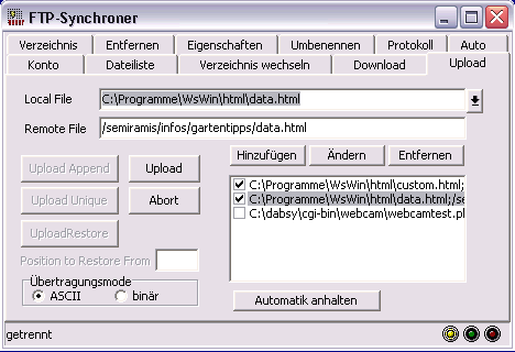 gewünschten Übertragungsmodus (ascii oder binär) ein. Mit dem Knopf Hinzufügen werden die Dateinamen und der eingestellte